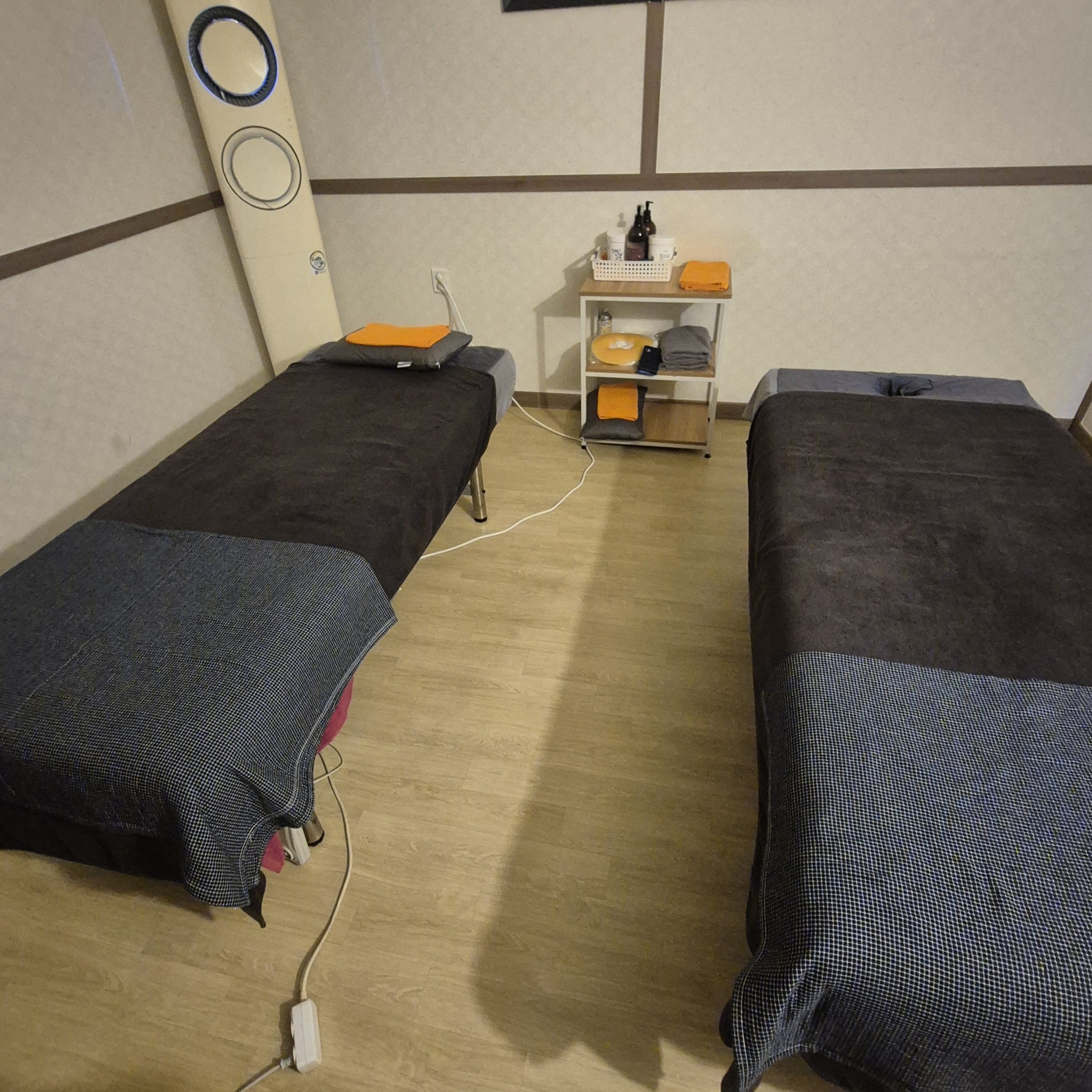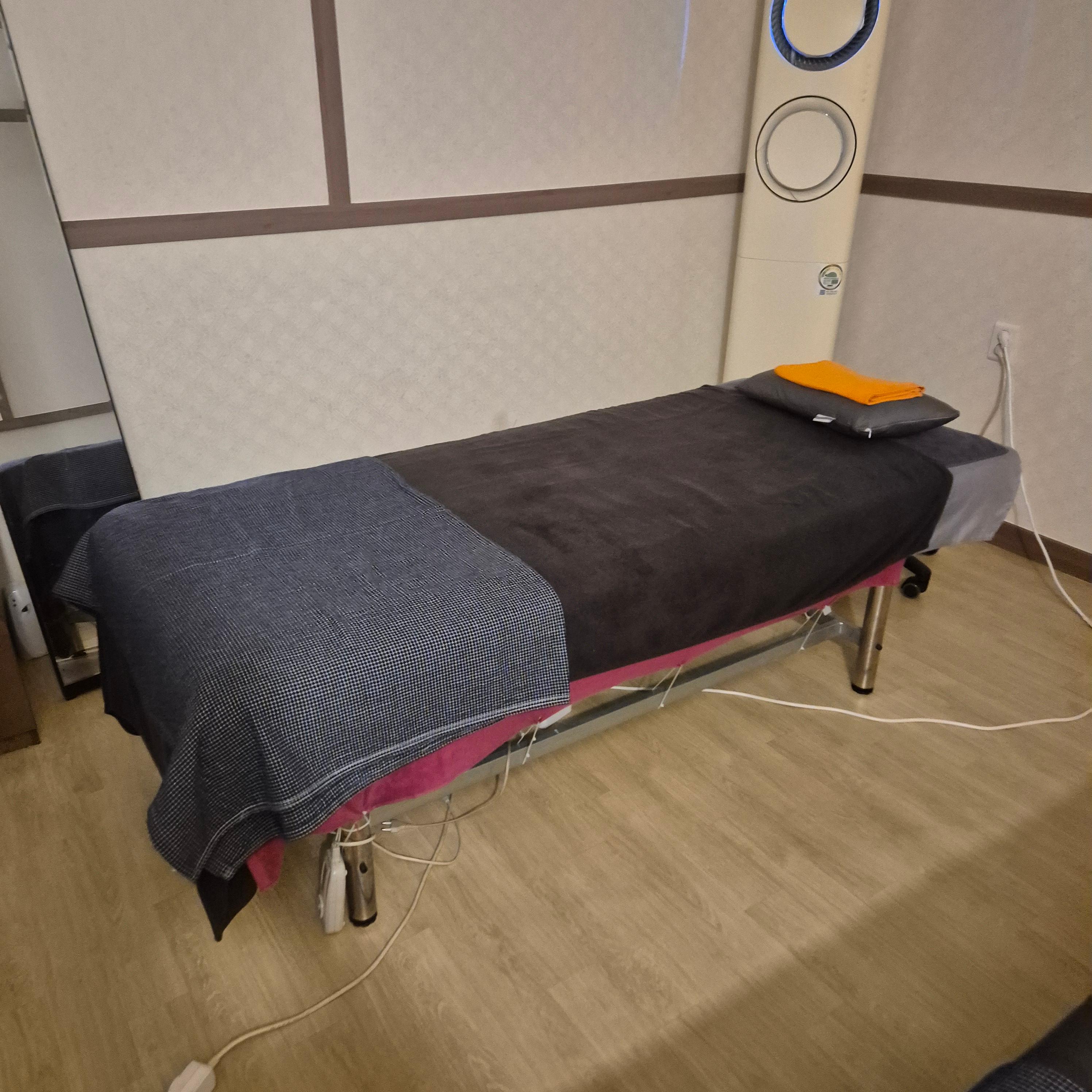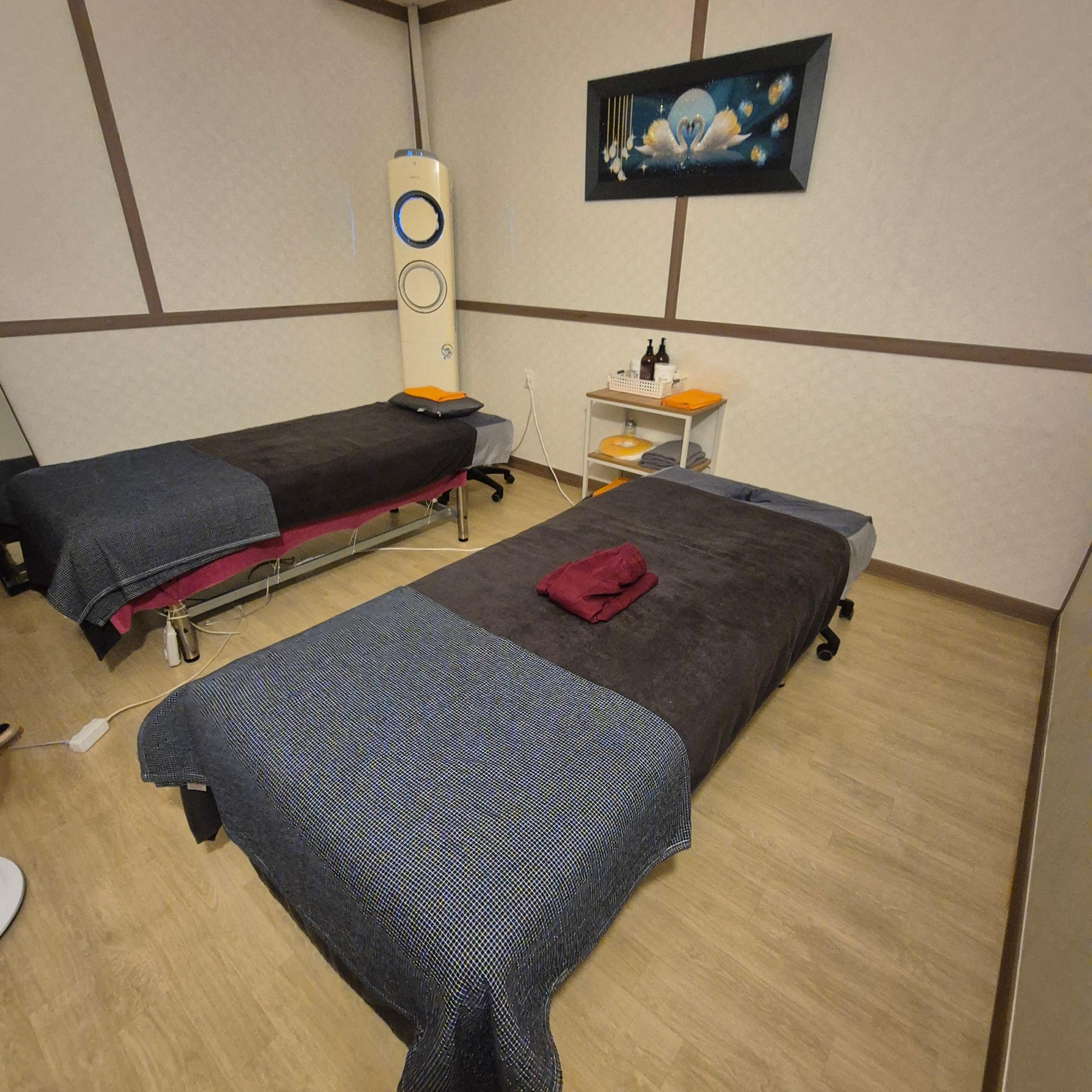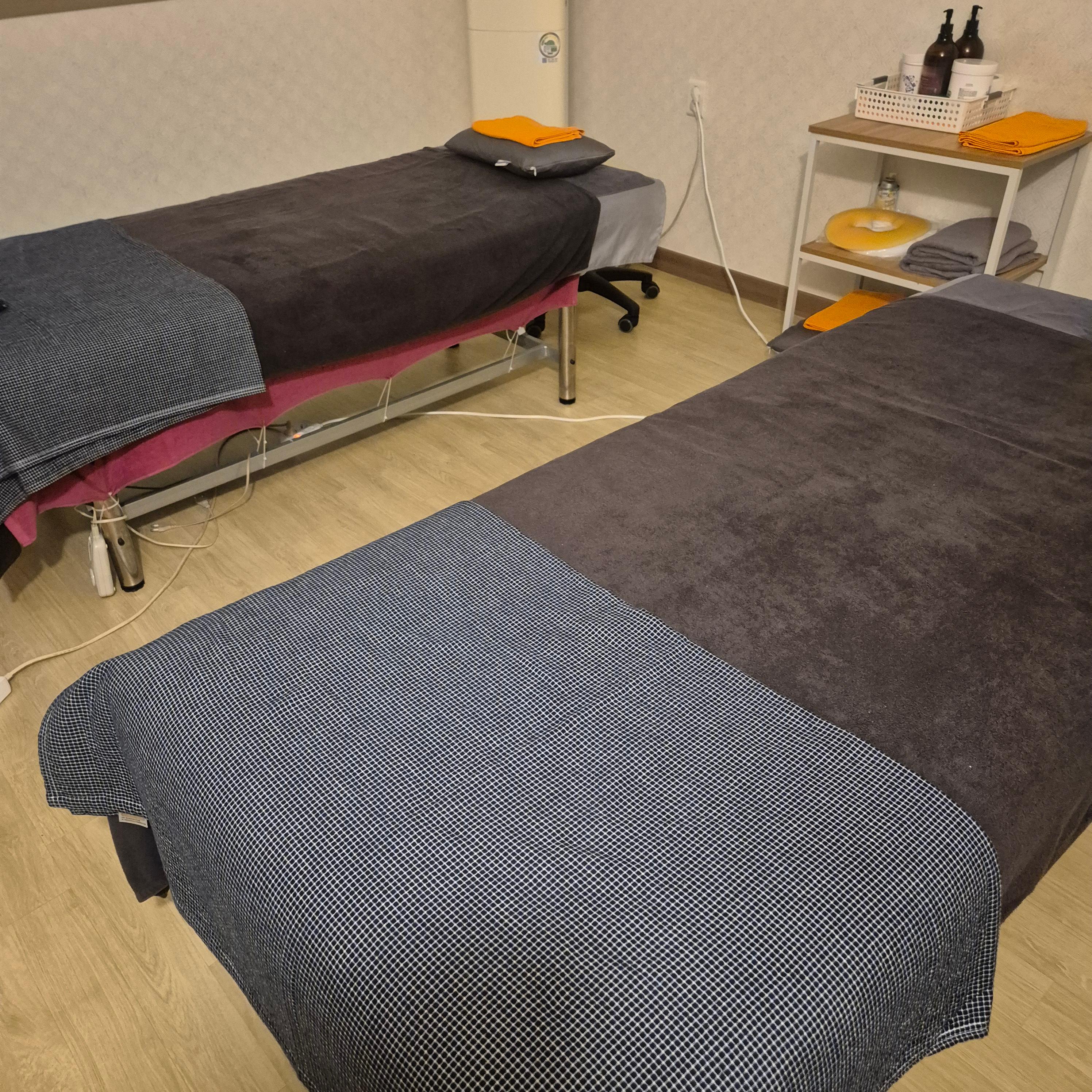 마사지 룸은 커튼으로 구획이 나뉘어 있어서